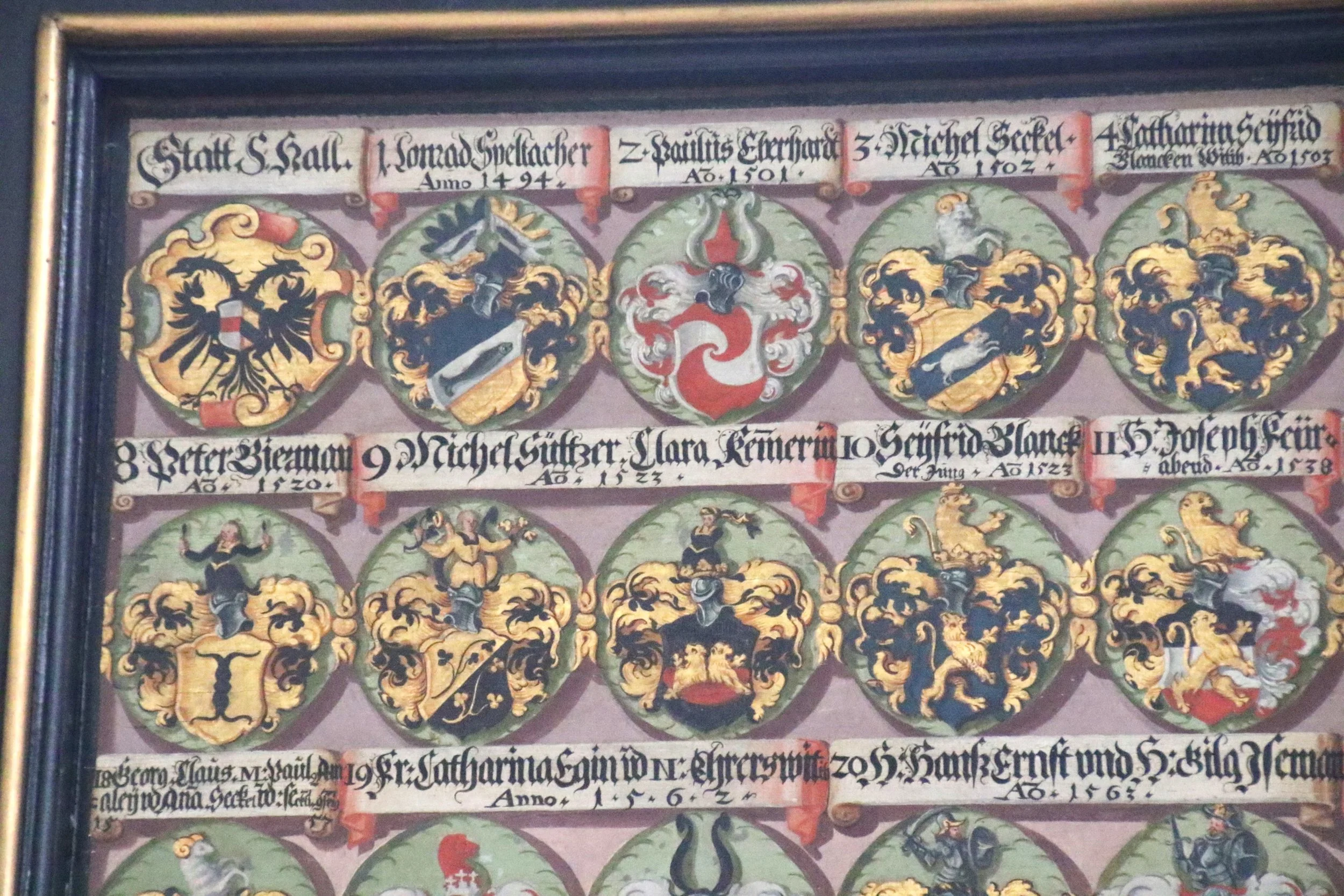 Stifterwappen board contains family "crests" to note donations for educational scholarships